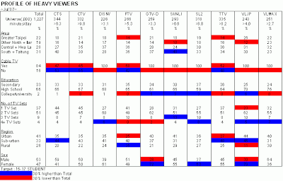 –民視和台視在大台北地區,三立台灣台和緯來日本在其他北區為低於整體收視人口30%以上;三立台灣台在南部有高出30%以上比例收視人口